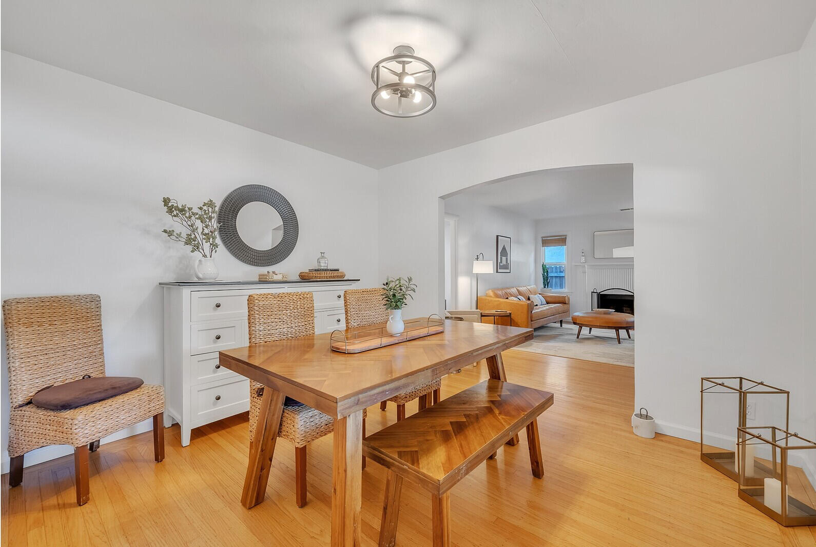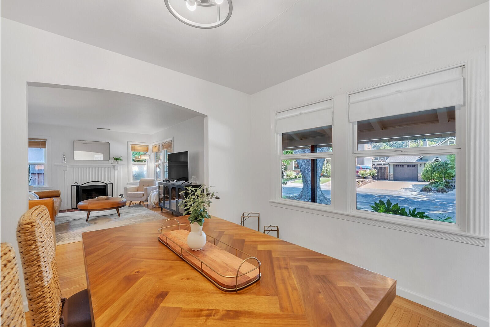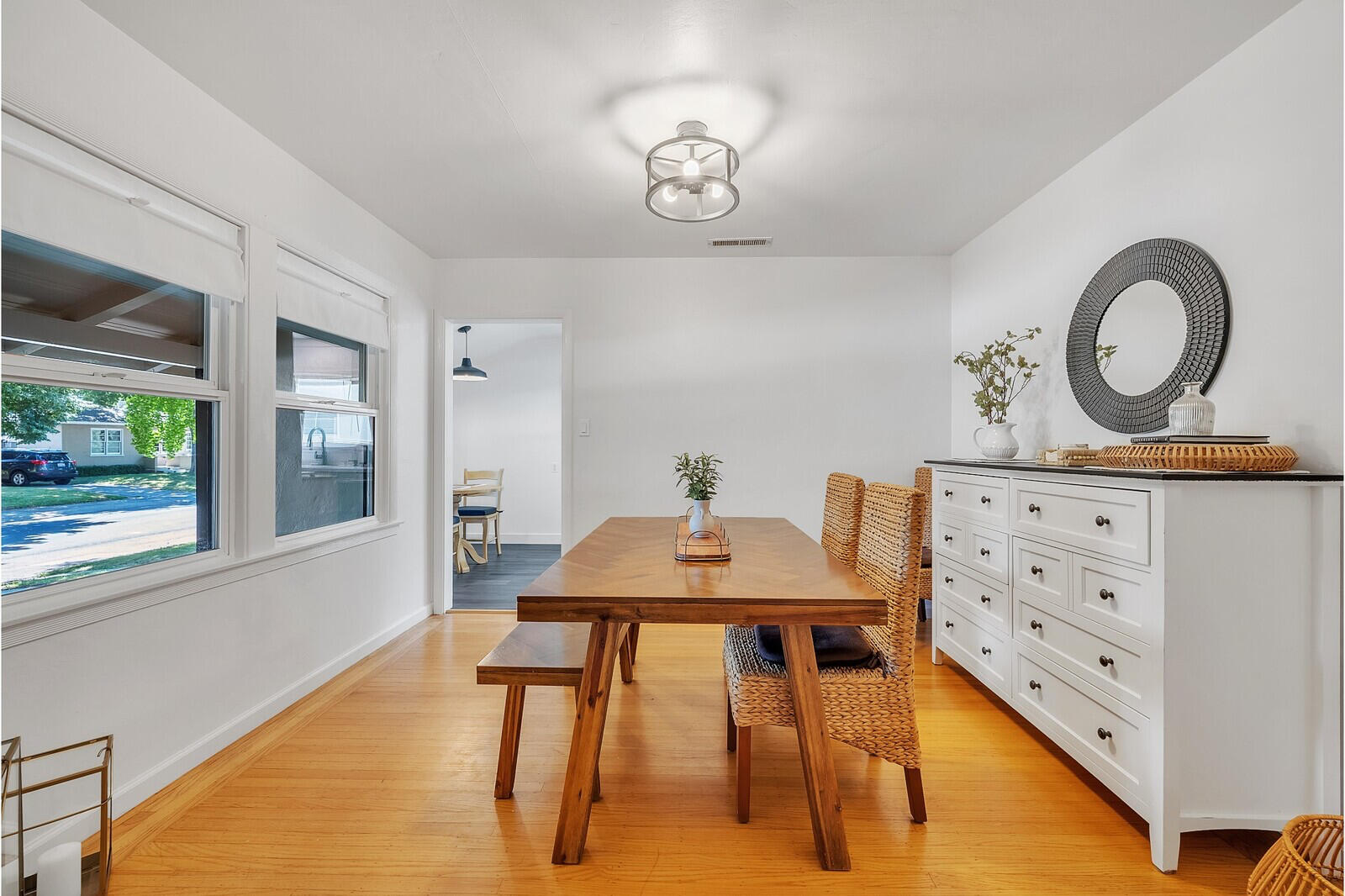 This charming dining room features a beautiful herringbone wooden dining table with matching bench seating and chairs. Perfect for cozy family dinners or lively gatherings which are sure to create memorable moments. The room has a large buffet cabinet for design and storage. The large windows looking out to the tree lined street gives it a calming yet vibrant atmosphere.