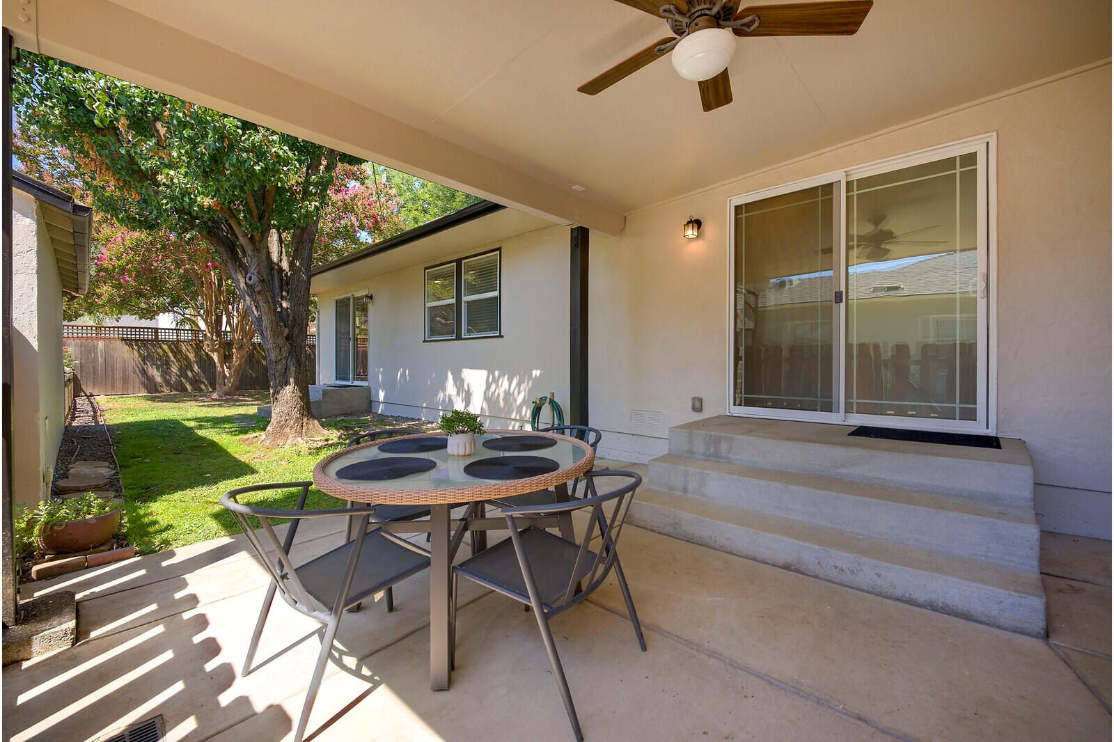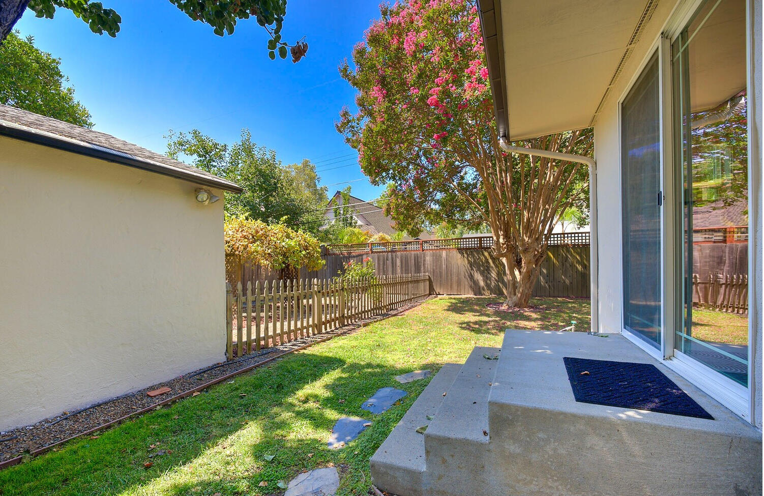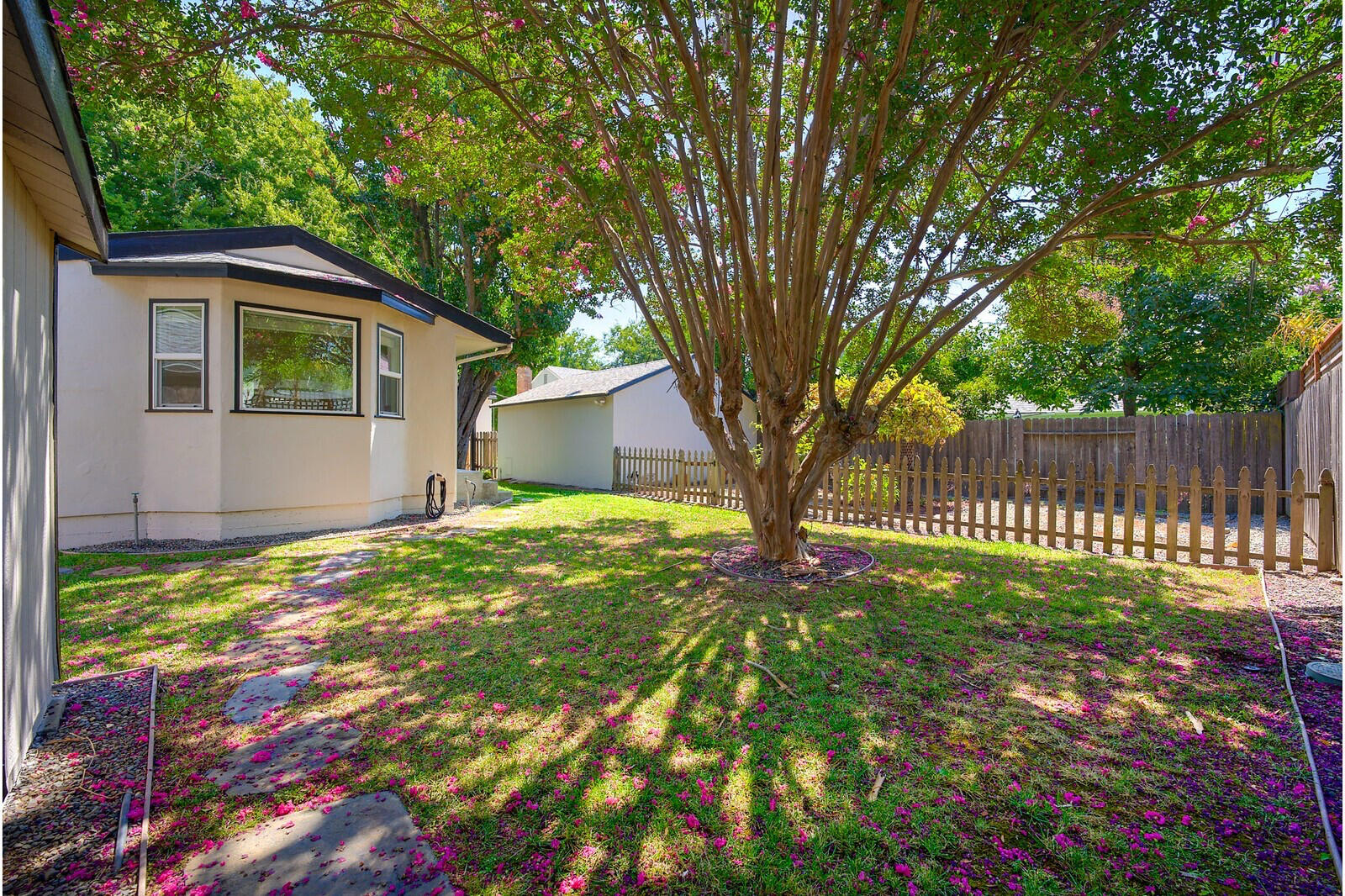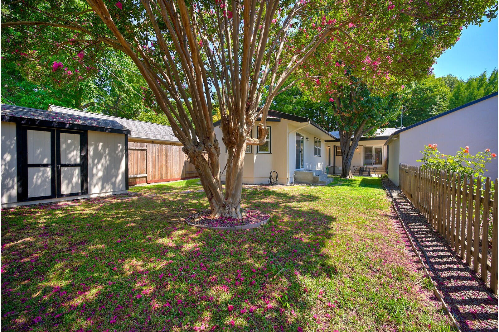 A private yard featuring large pear & crape myrtle trees for ample shade in the warm months and an enclosed garden. Embrace the joys of outdoor living with this private backyard oasis.