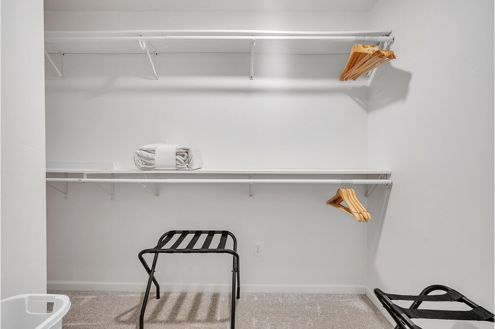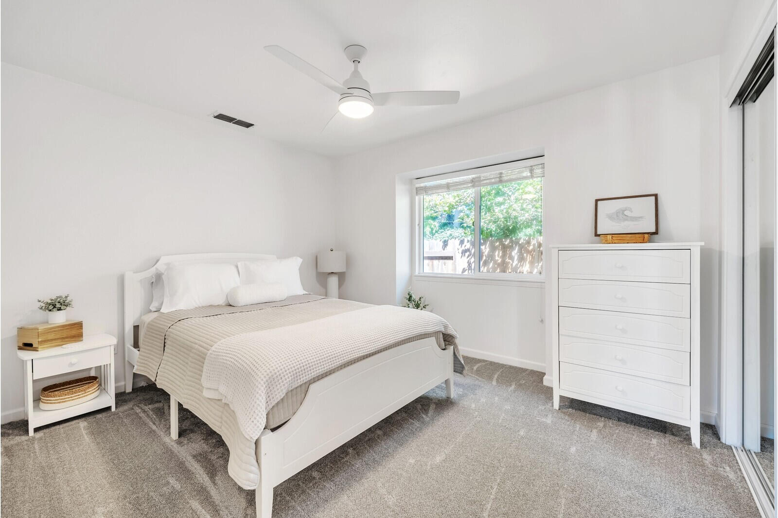 This second bedroom (the white room) features a comfortable queen-sized bed and tall dresser for storage. Large mirrored door closets not only provide for more ample storage but also enhance the room's brightness and sense of space, reflecting natural light and offering a convenient dressing area. The minimalist decor and white/neutral color palette create a tranquil ambiance.