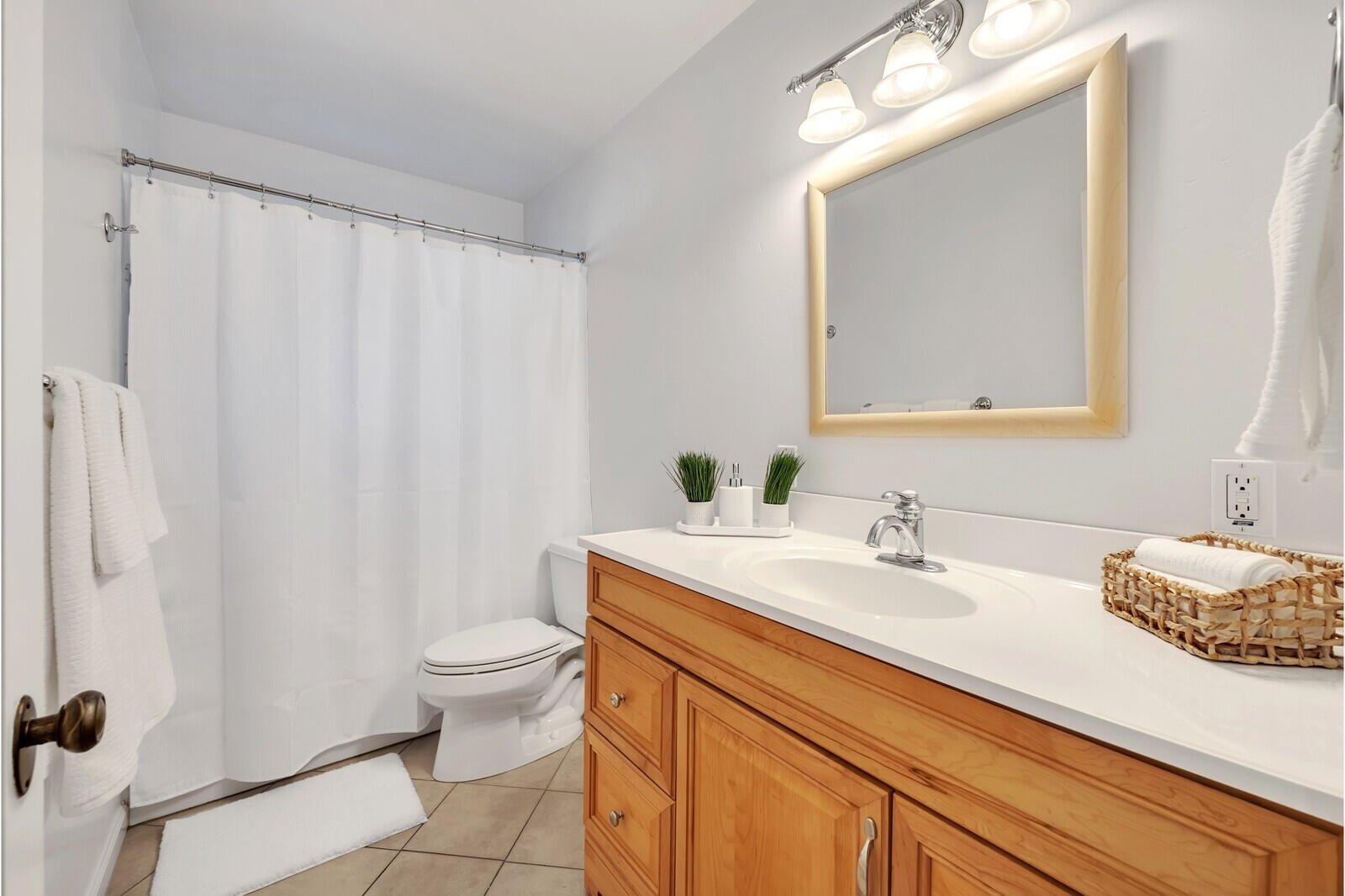 This second bathroom, featuring light wood cabinets & white walls, brings that sense of desired cleanliness with a touch of warmth to the space. The practical and stylish design includes a shower-tub combo, providing flexibility for both quick showers and relaxing baths.
