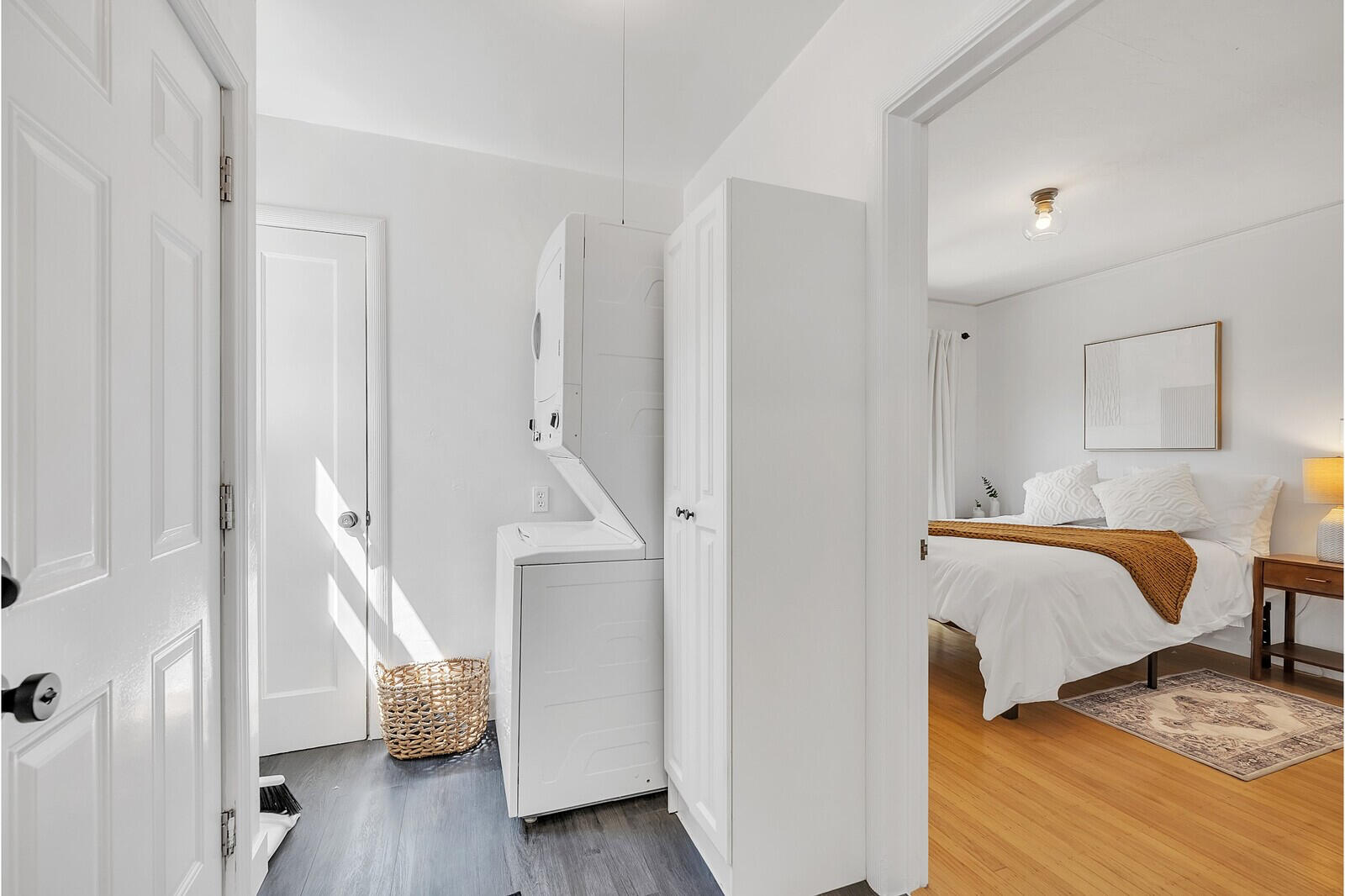 This compact yet highly functional area features a stackable washer and dryer. A tall cabinet provides ample storage for cleaning supplies, ensuring everything you need is neatly organized and easily accessible.