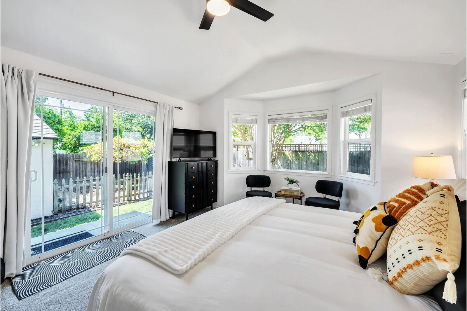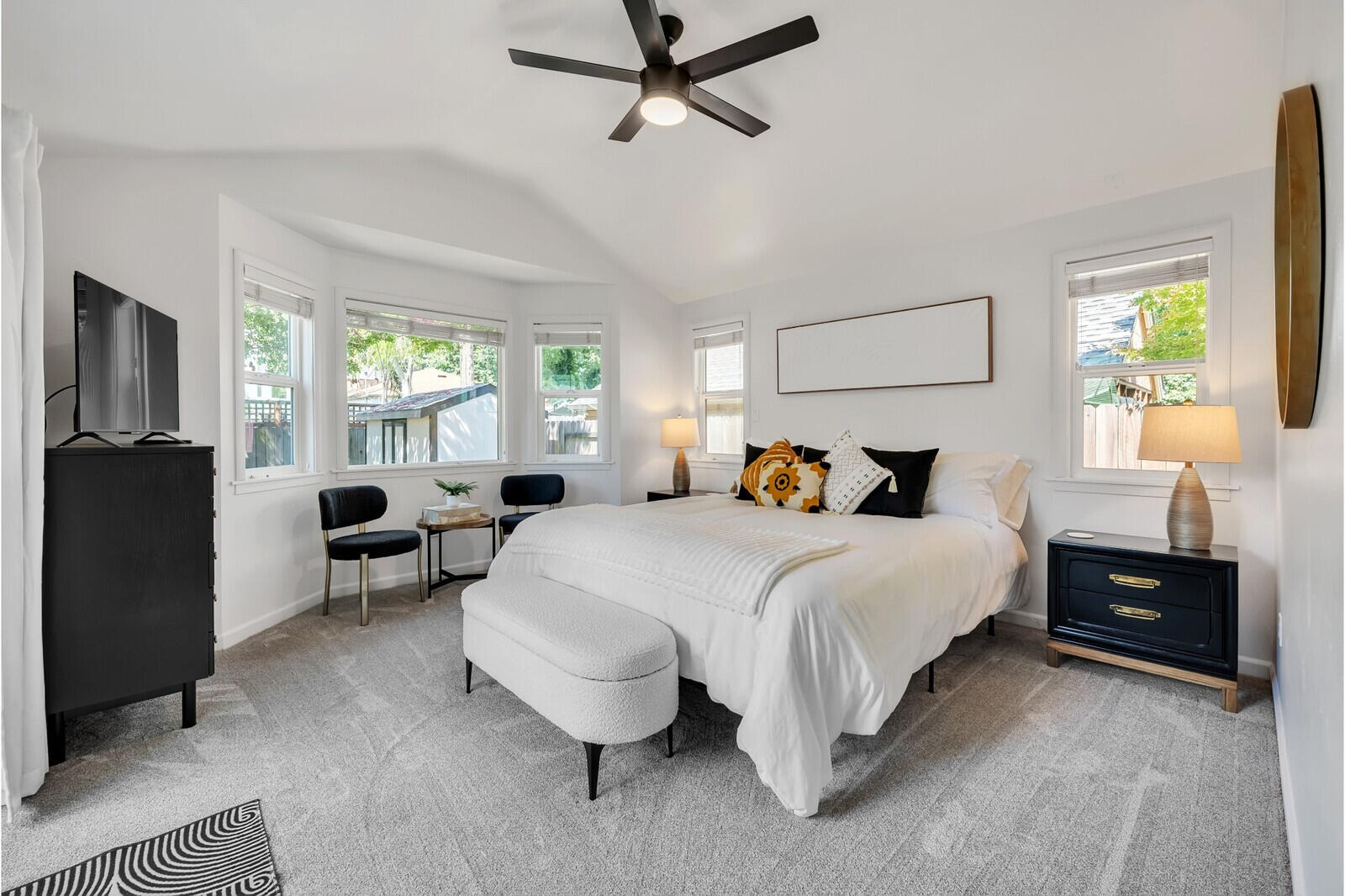 This master bedroom blends mid century sophistication with ultimate comfort. The spacious room features a plush, california king-sized bed and upholstered storage bench at the foot. Large windows frame the room, filling it with natural light and offering picturesque views of the surrounding private backyard & a glass slider leading to the outdoors. A cozy seating nook by the bay windows provides a perfect spot for morning coffee or a quiet reading corner. The room also includes refurbished black vintage dresser and nightstands, ensuring ample storage space along with a chic aesthetic.
