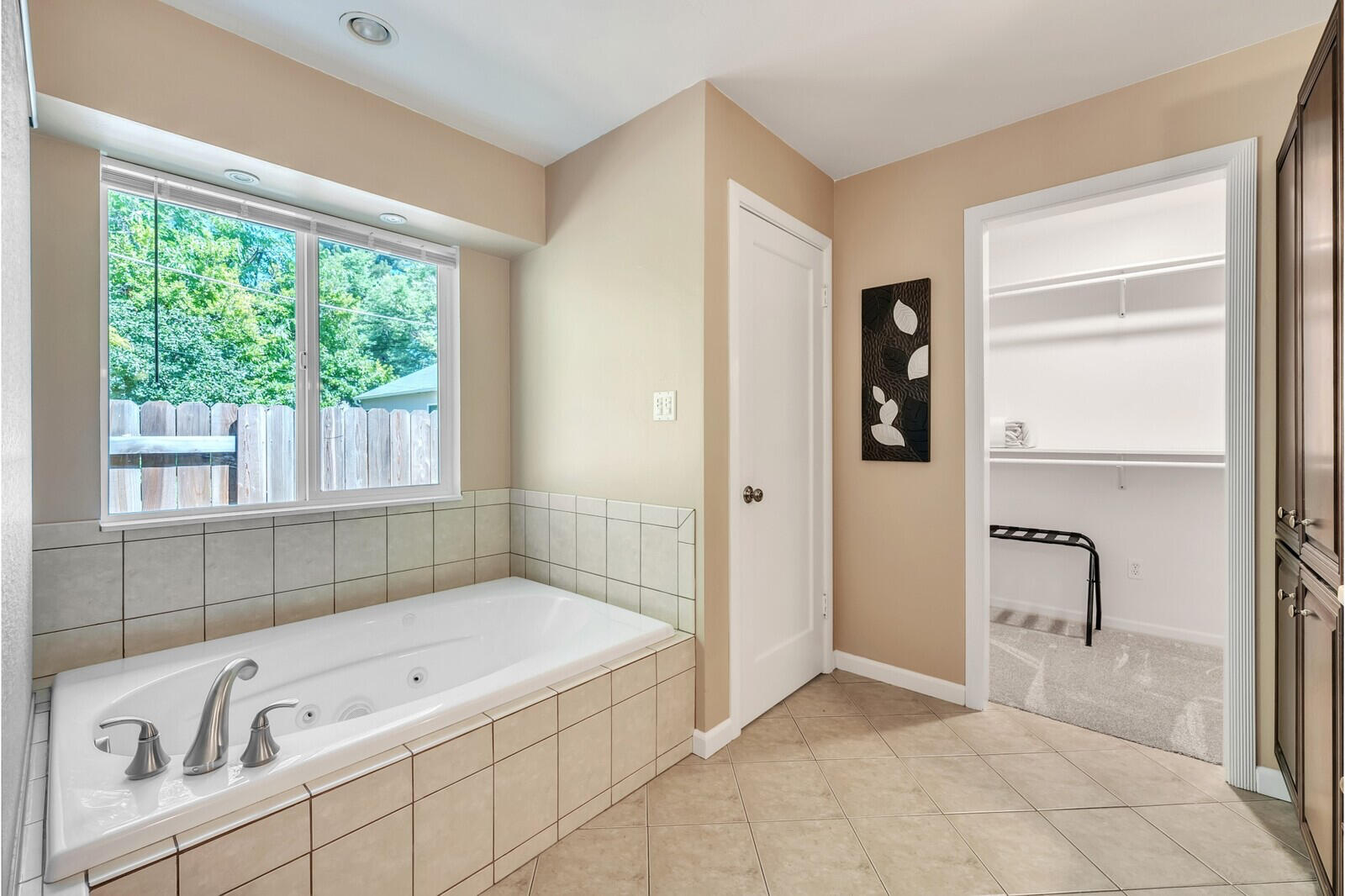 Styled with a vintage dresser, adding character and timeless elegance to the space, and a walk-in closet maintaining the room's mid-century aesthetic.