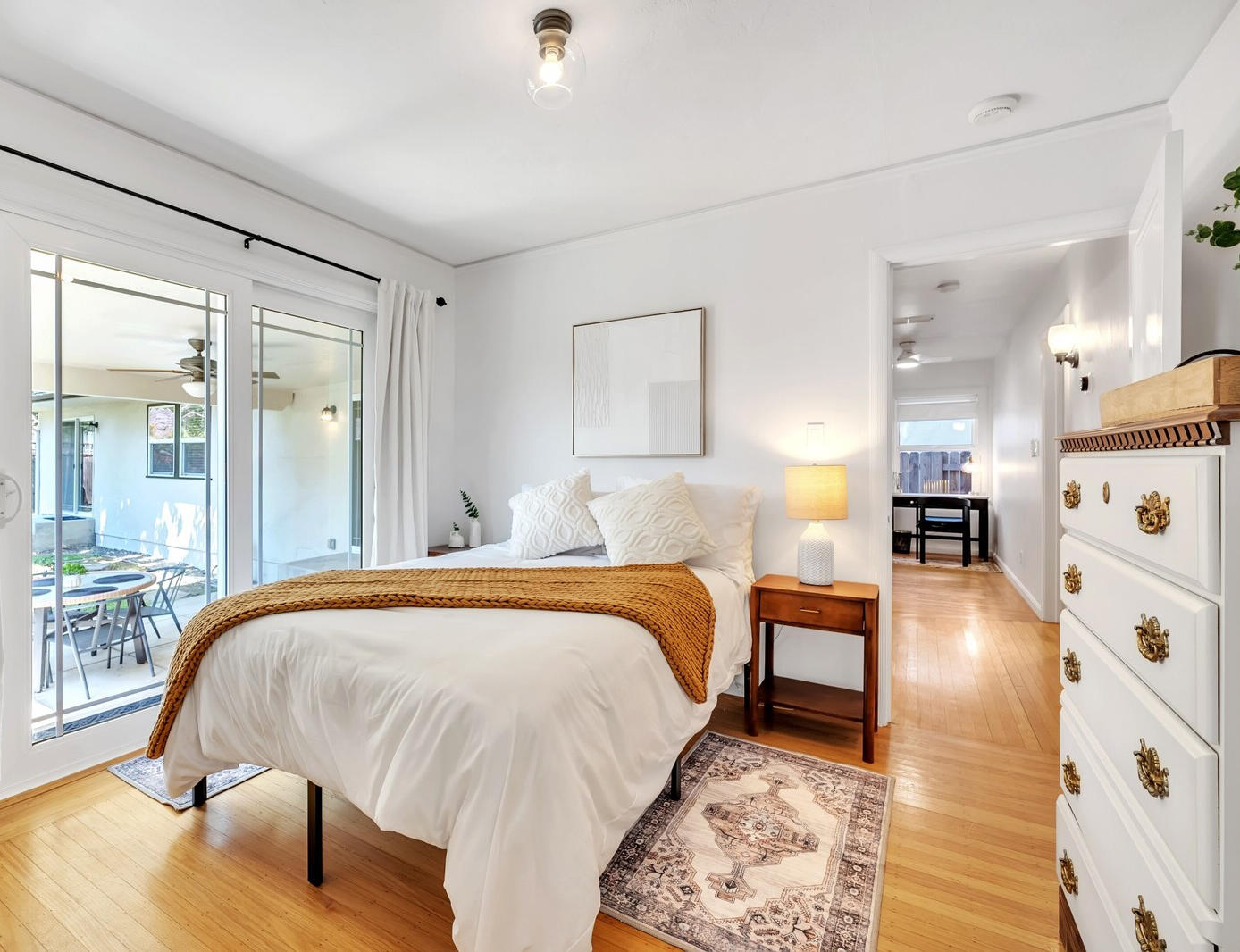 The third bedroom (called the “OG Bedroom” because it’s original to 1940), featuring a full size bed is a perfect blend of modern convenience and vintage charm. It features a sliding glass door that opens onto a private patio, creating a seamless connection between indoor and outdoor living.